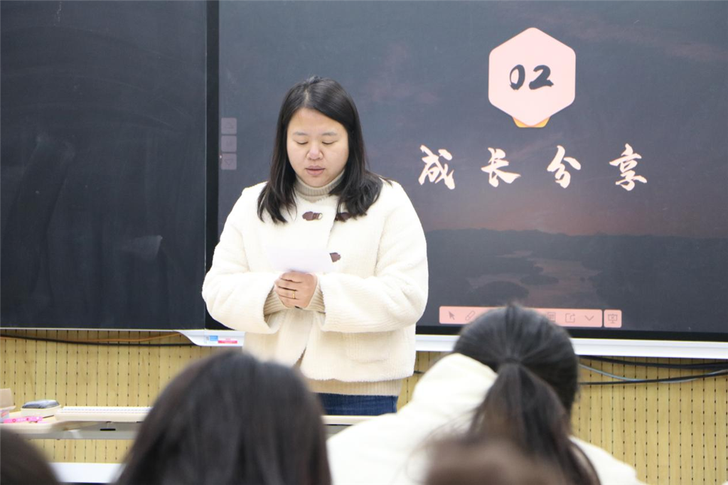 在成长分享环节,各学科教师代表依次上台交流感悟。音乐组陶文晖老师秉持共创理念,让师生在共同探索中传承民族文化;体育组刘玥老师提炼出备赛参赛的“磨砺、启迪、前行”三大核心感悟;美术组陈姝堉老师以钉子“钻”劲深耕教学细节,引领学生在实践中感受美术魅力;科学组蒋璐老师打造共创课堂,平衡知识传递、兴趣激发与科学探究的关系;信息组邱一辉老师主张以真实情境驱动教学,让学生体会信息技术的实用价值;综合组宋佳老师以《拾光而上,共赴山海》为题,分享了自己的成长历程以及在共创课堂中与学生相伴成长的点滴,给年轻老师带来启迪。